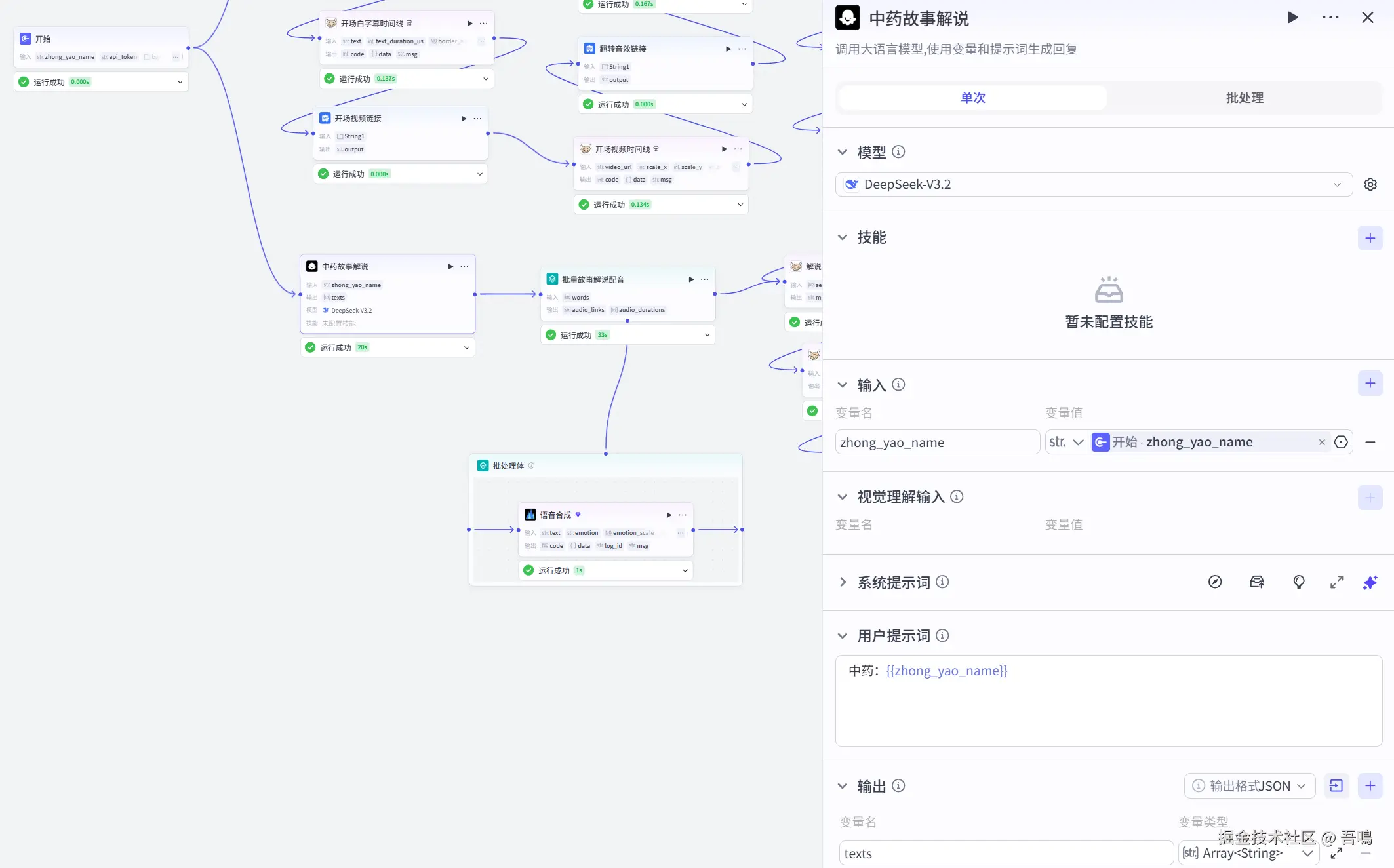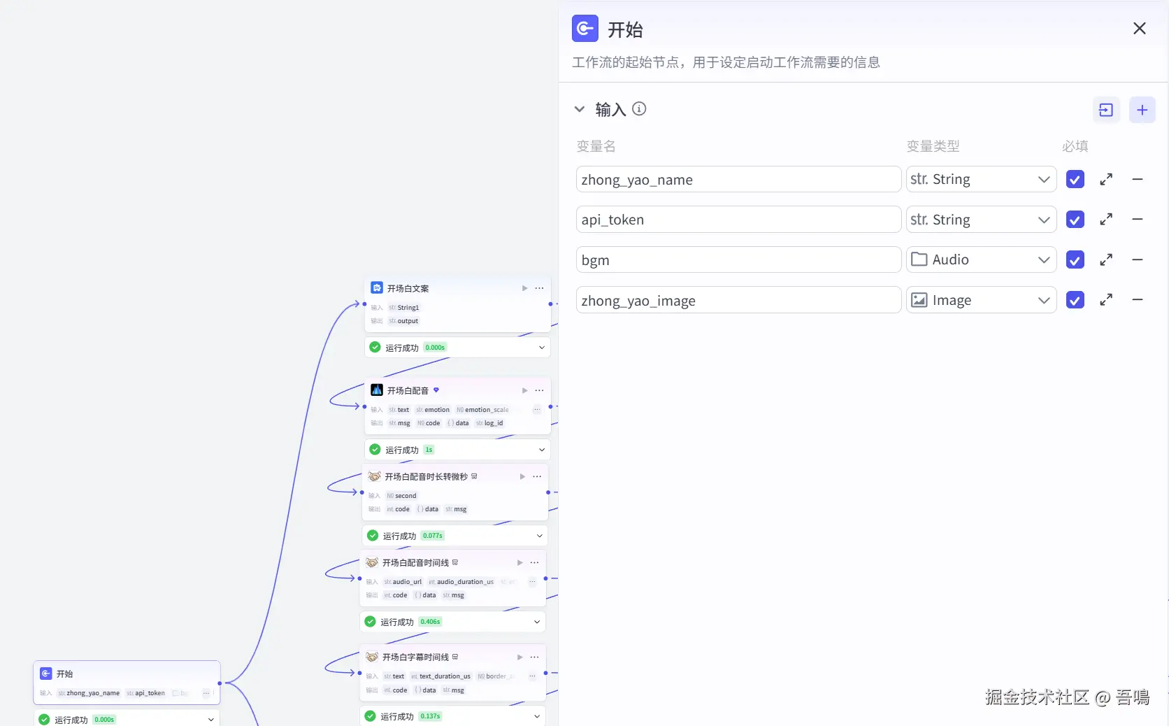 经过对这些作品的分析,我用扣子(Coze)工作流把它的内容创作的流程可固化了下来,只需要输入中药名称和一张中药的封面图片,便可以实现自动化创作。