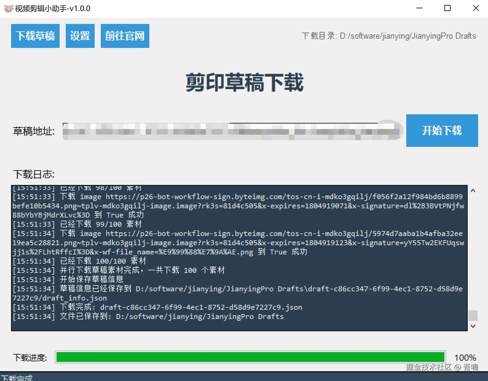 在工作流运行完成后,将会得到剪映草稿的下载地址,只需要打开视频剪辑小助手,把草稿地址复制过去,点击下载,便可以把剪映草稿下载到剪映中。