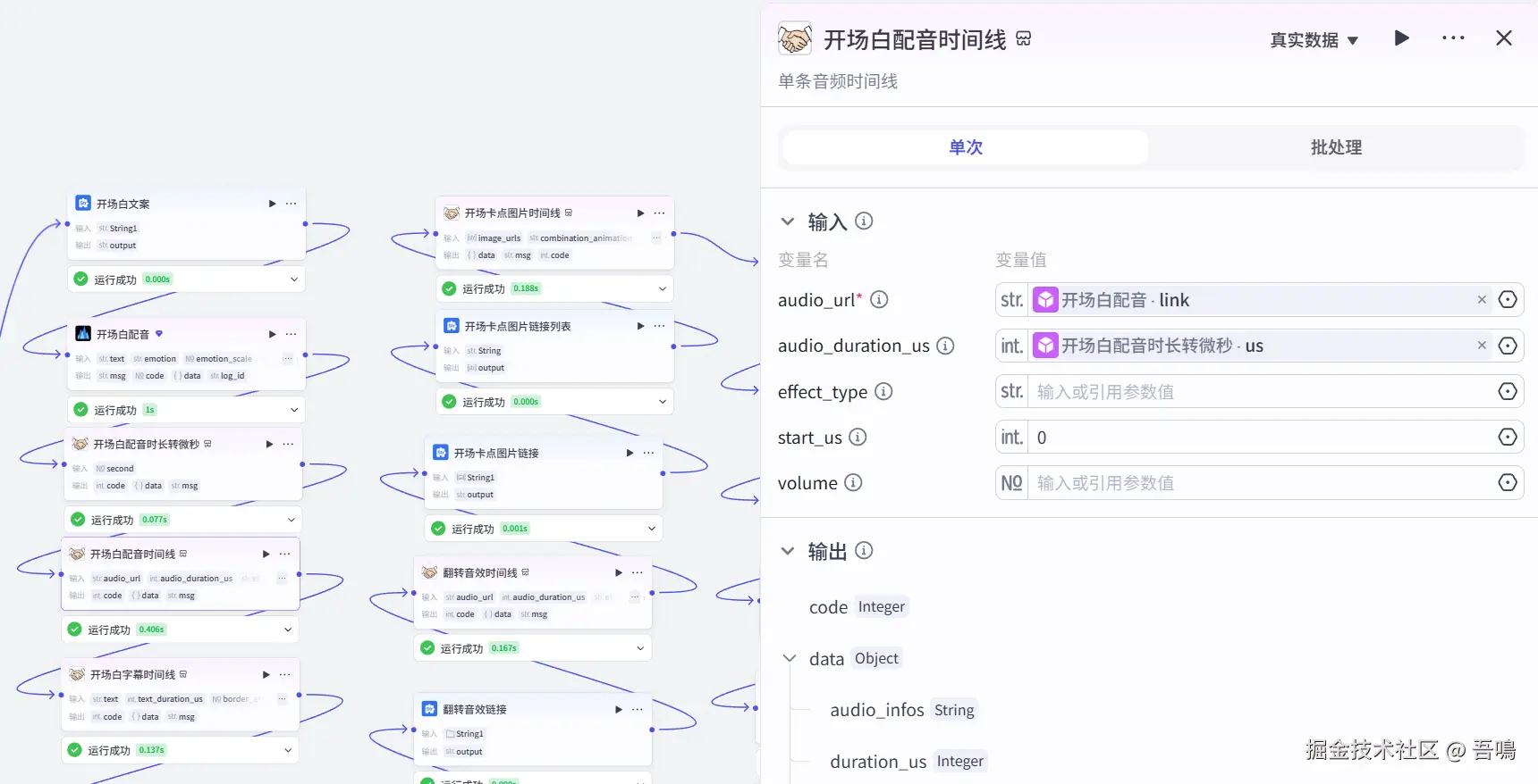 这个节点用来生成开场白配音在剪映草稿上的语音时间线,使用到了扣子三方的插件【视频剪辑工具箱】的【single_audio_timeline】工具。