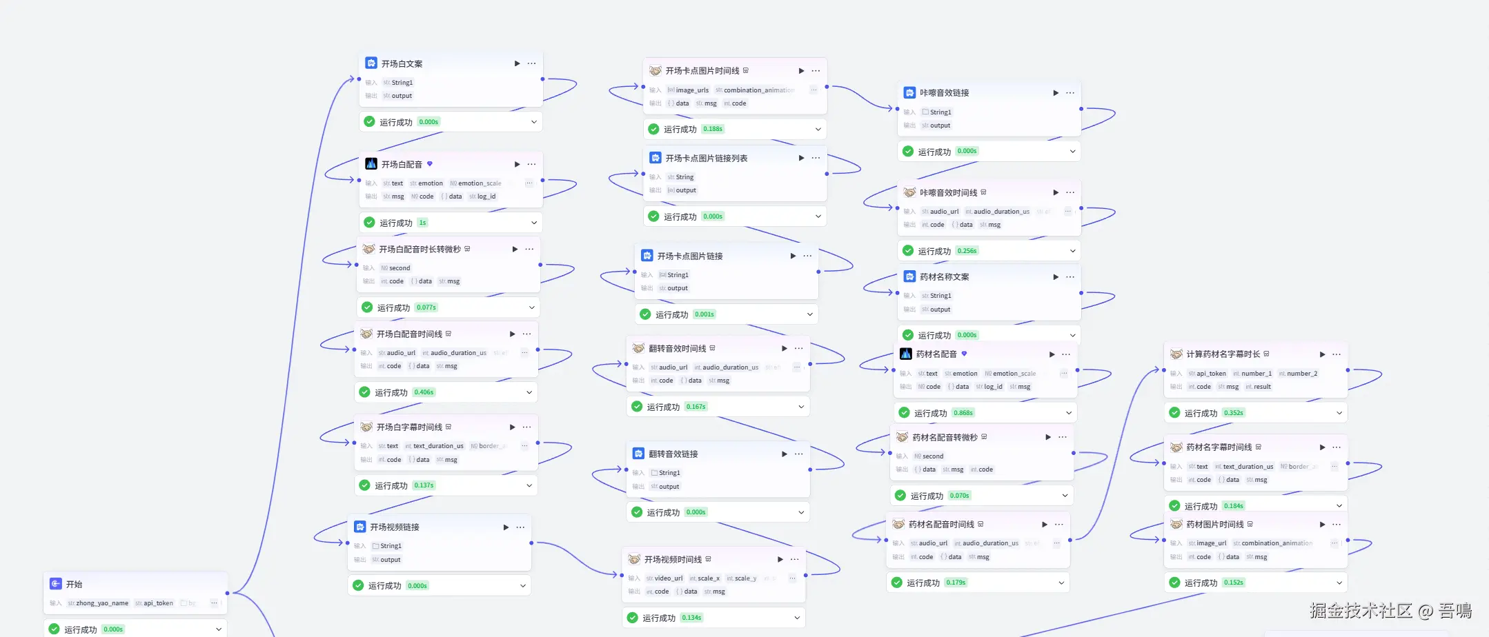 像开头的动画、“听故事学中药,今天讲的是XXX”这些配音,还有中药图片卡点部分的内容都是由这部分节点负责制作。