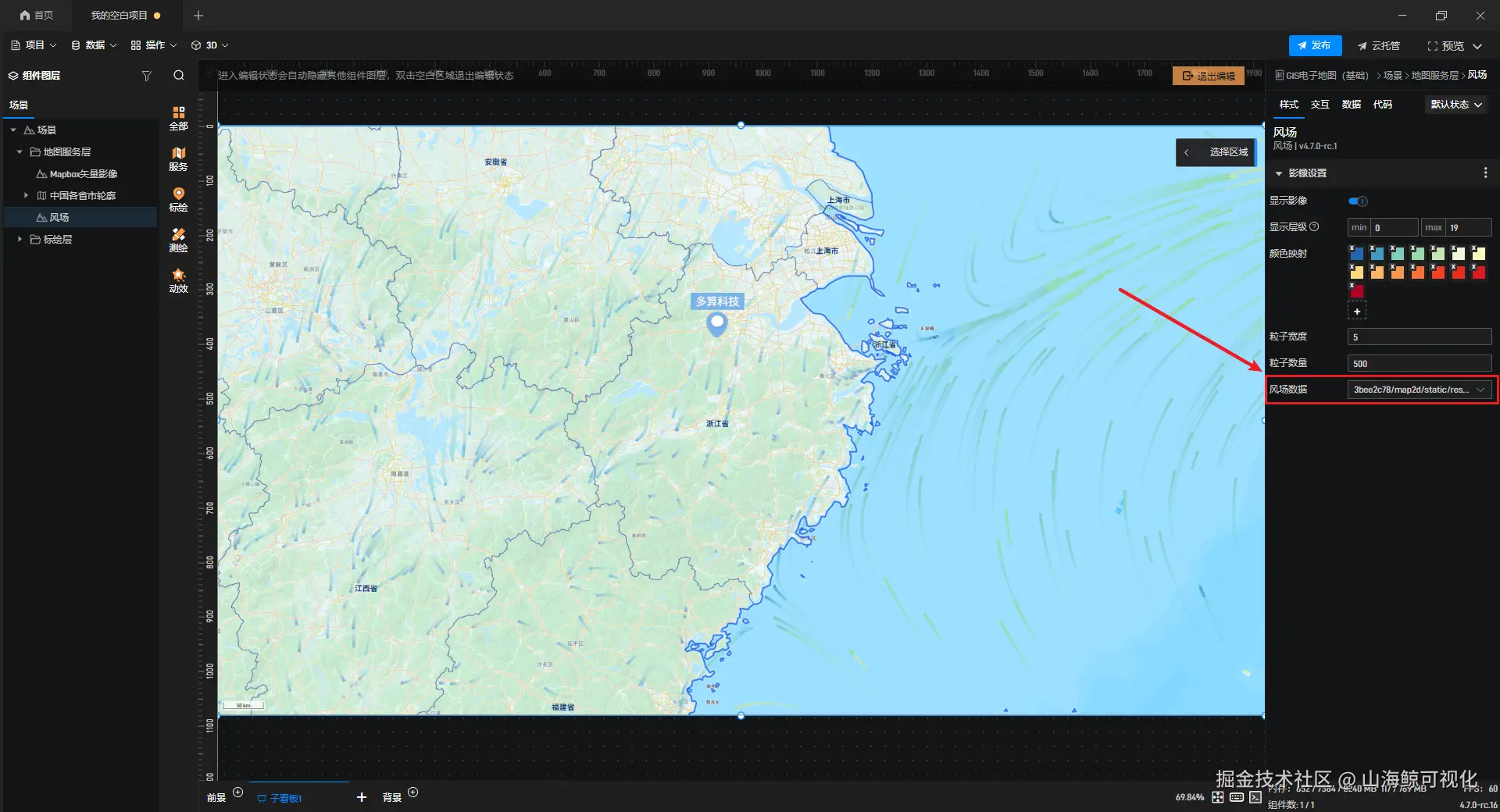 风场是全新增加的功能,我们可以通过风场来展示当前地图中的气象、洋流、风向等信息。
