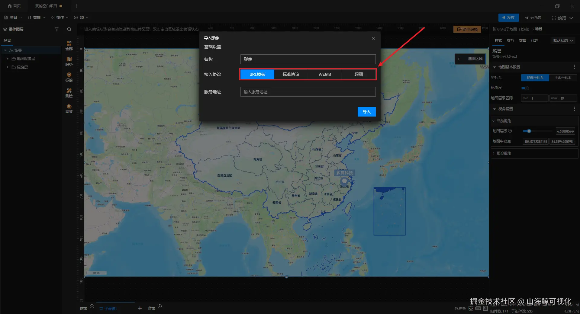 导入影像支持URL模板、标准协议、ArcGIS、超图等协议,添加服务地址后点击右下角 “导入” 即可使用。