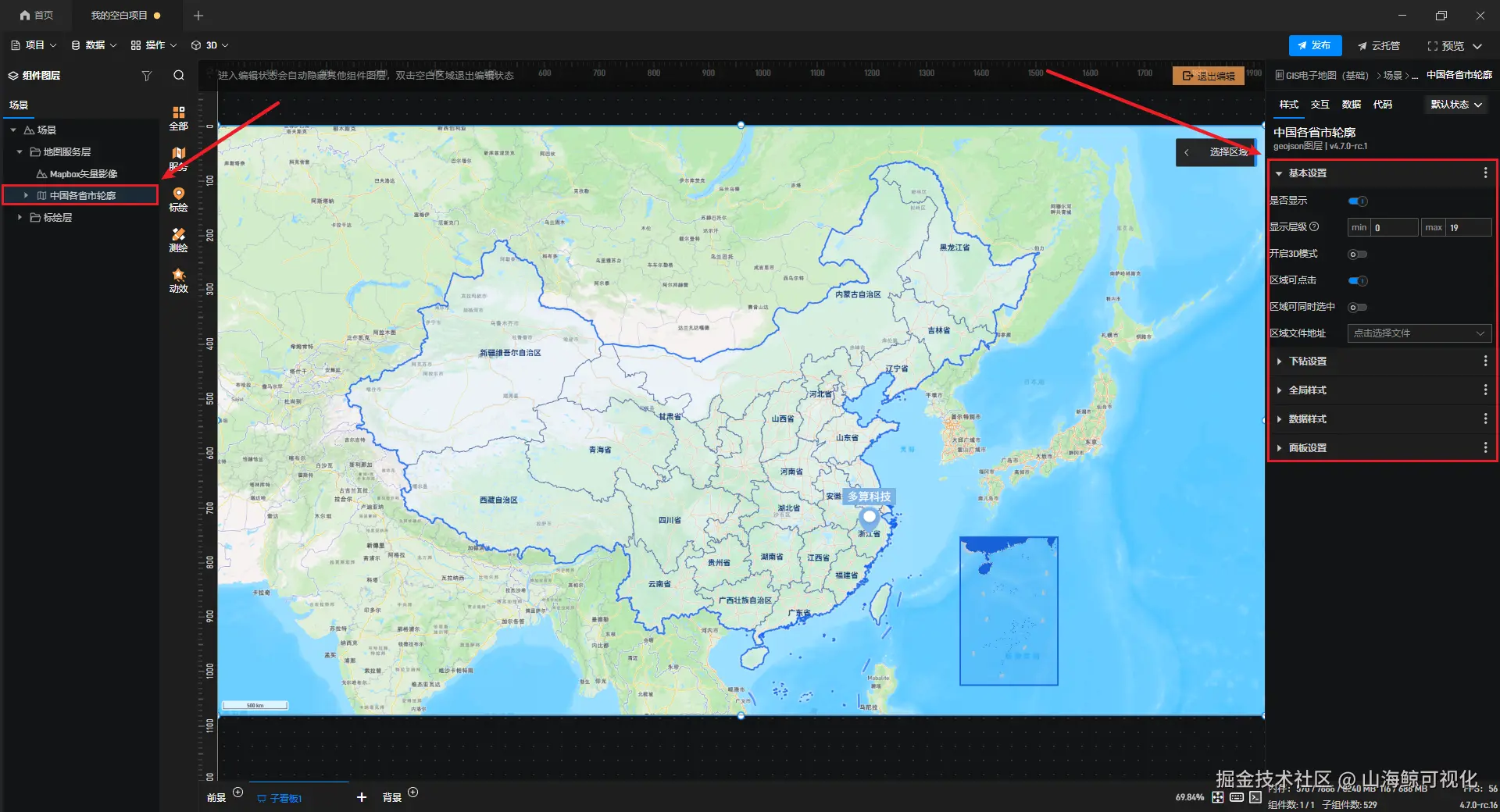 添加后,可对行政区域样式进行设置,还可以设置地图下钻、弹窗等功能。