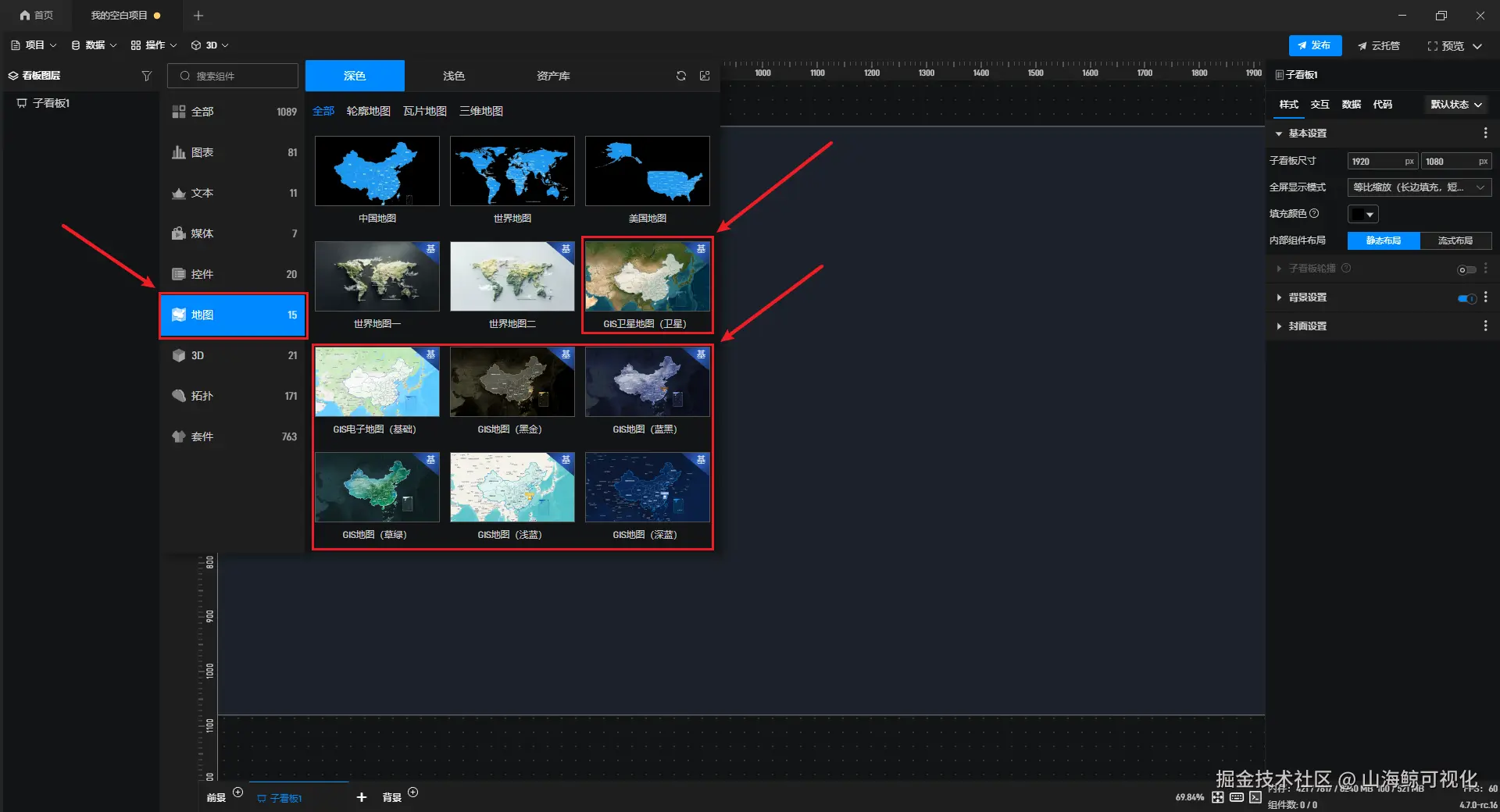 鲸地图可以在左侧组件库的 “地图” 分类中添加,其中包含许多种类,它们只有外观不同,功能设置上是相同的。