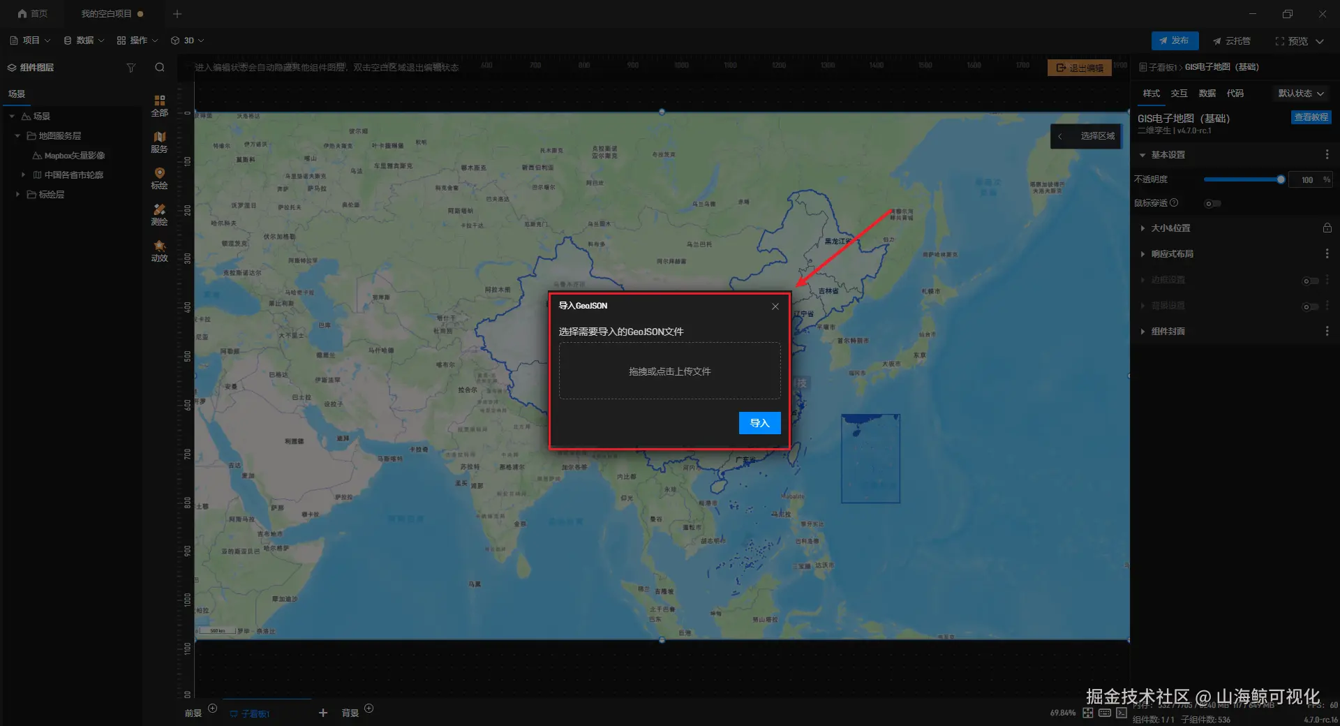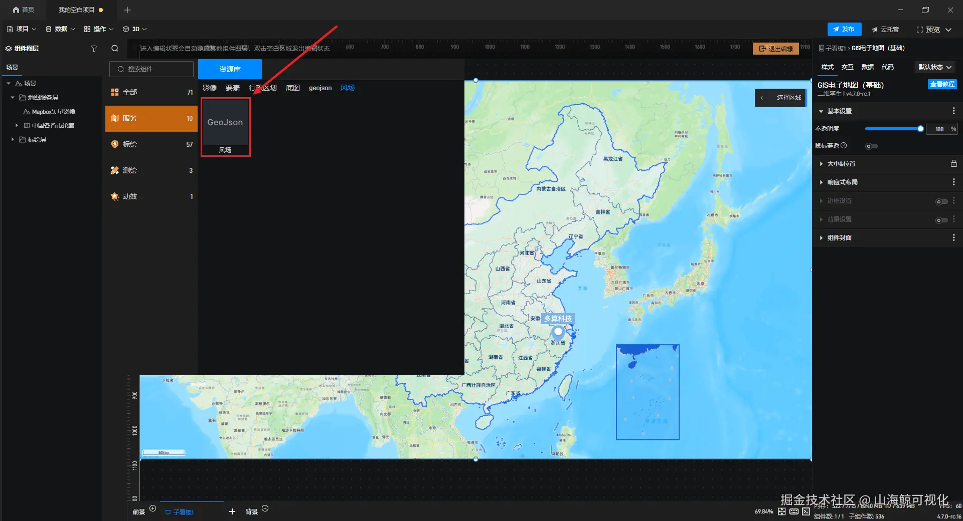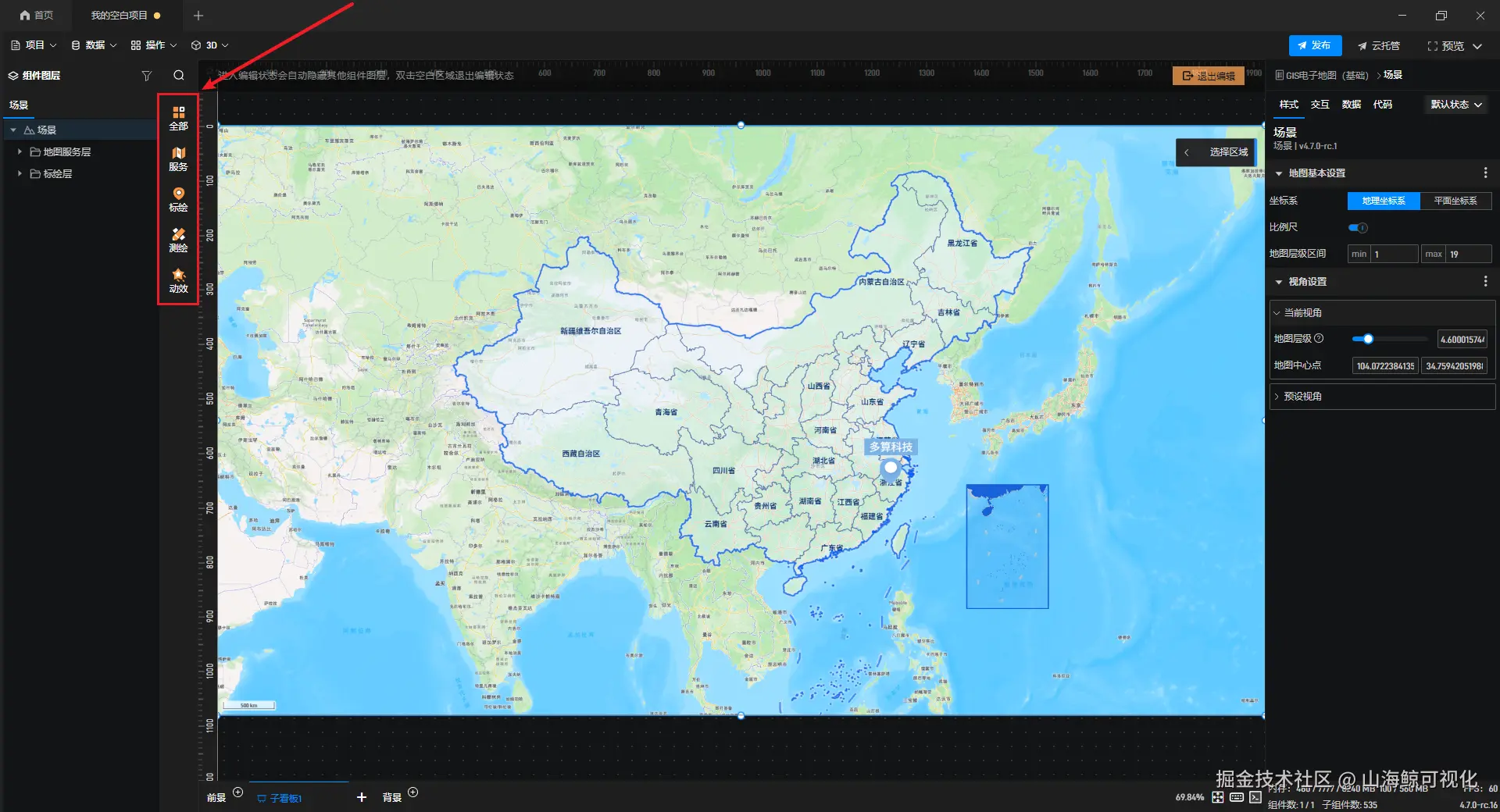 添加后,双击鲸地图即可进入编辑模式,对鲸地图进行编辑,此时可以看到左侧组件库变为了鲸地图专用的资源库。