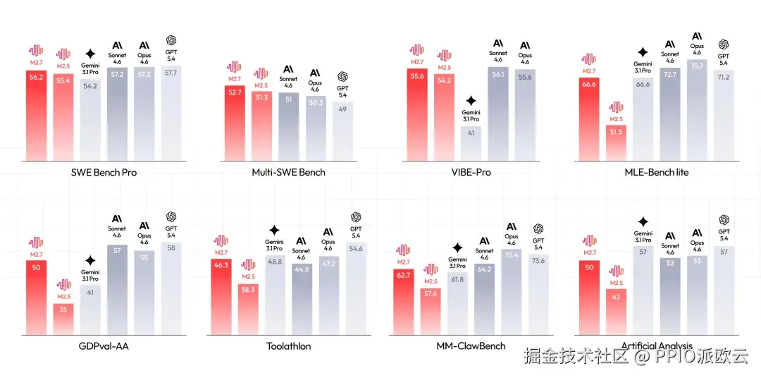 在 Repo 级代码生成基准 VIBE-Pro 上,M2.7 得分55.6%,几乎与 Opus 4.6持平 —— 这意味着无论是 Web、Android、iOS 还是 Simulation 类需求,都可以直接交给 M2.7 完成。