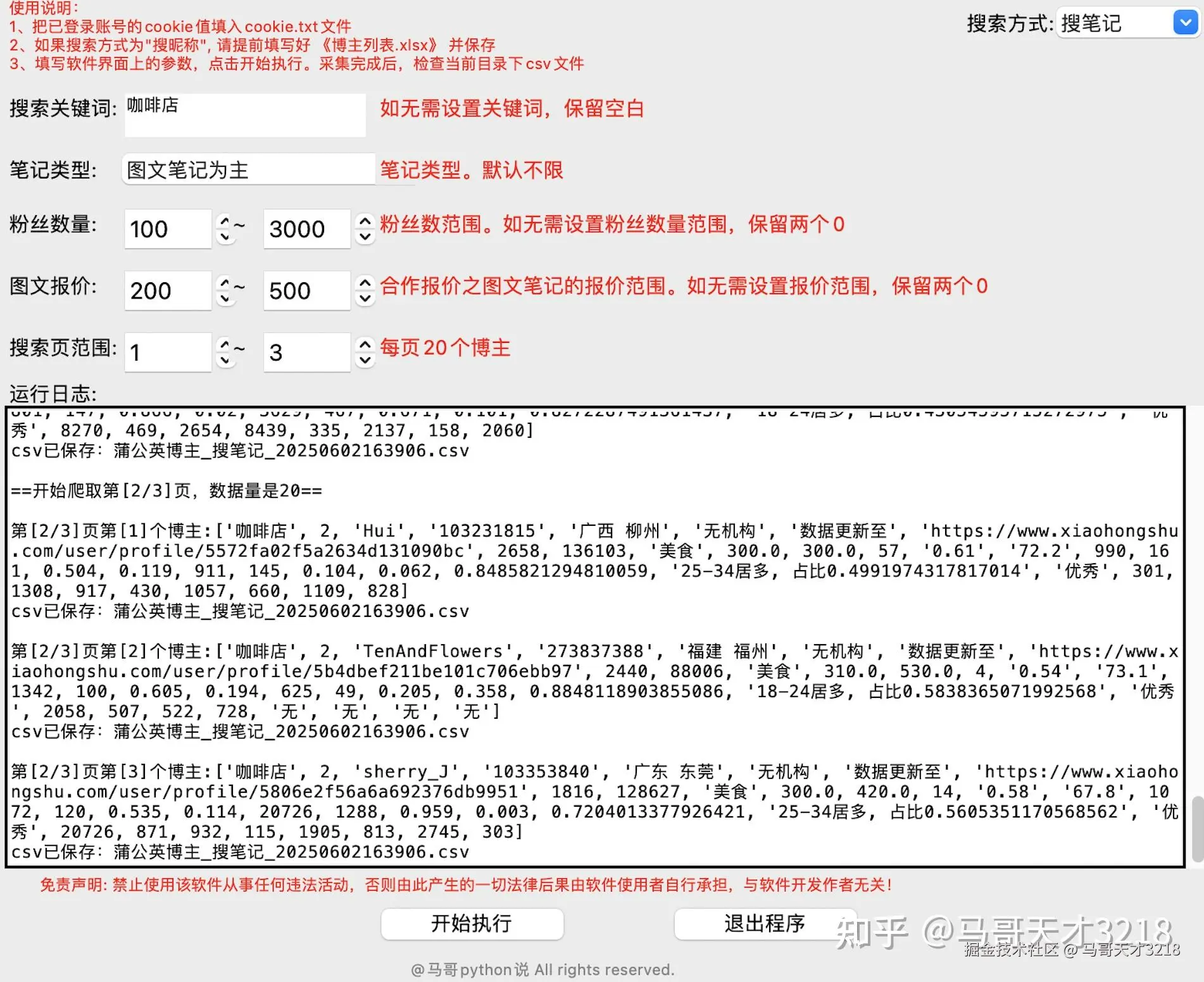 软件采用逐条实时保存策略,每采集到一个博主的数据就立即写入CSV文件。