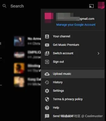 步骤二:点击 YouTube Music 界面上的个人资料图标,找到 “上传音乐” 部分。然后,您可以从电脑中选择音乐文件,并将其拖放到指定的上传区域。