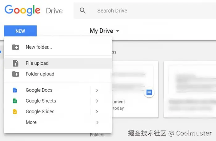 步骤 1. 在电脑上,登录您的 Google 帐户并访问 Google 云端硬盘。创建一个新文件夹或打开一个现有文件夹,用于存储您的音乐文件。点击 “新建” 按钮,然后选择 “文件上传” 上传单个音乐文件,或选择 “文件夹上传” 上传包含音乐文件的整个文件夹。等待上传过程完成。