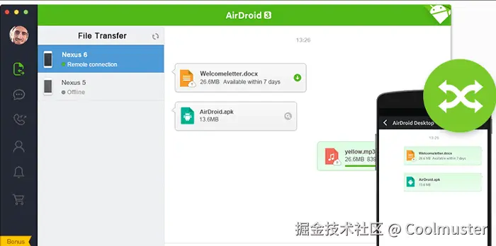 Airdroid是一款功能强大的应用程序,可让您通过电脑无线管理Android设备。使用 Airdroid,您可以通过网页浏览器界面将音乐文件直接从电脑传输到Android手机,无需数据线或额外软件。