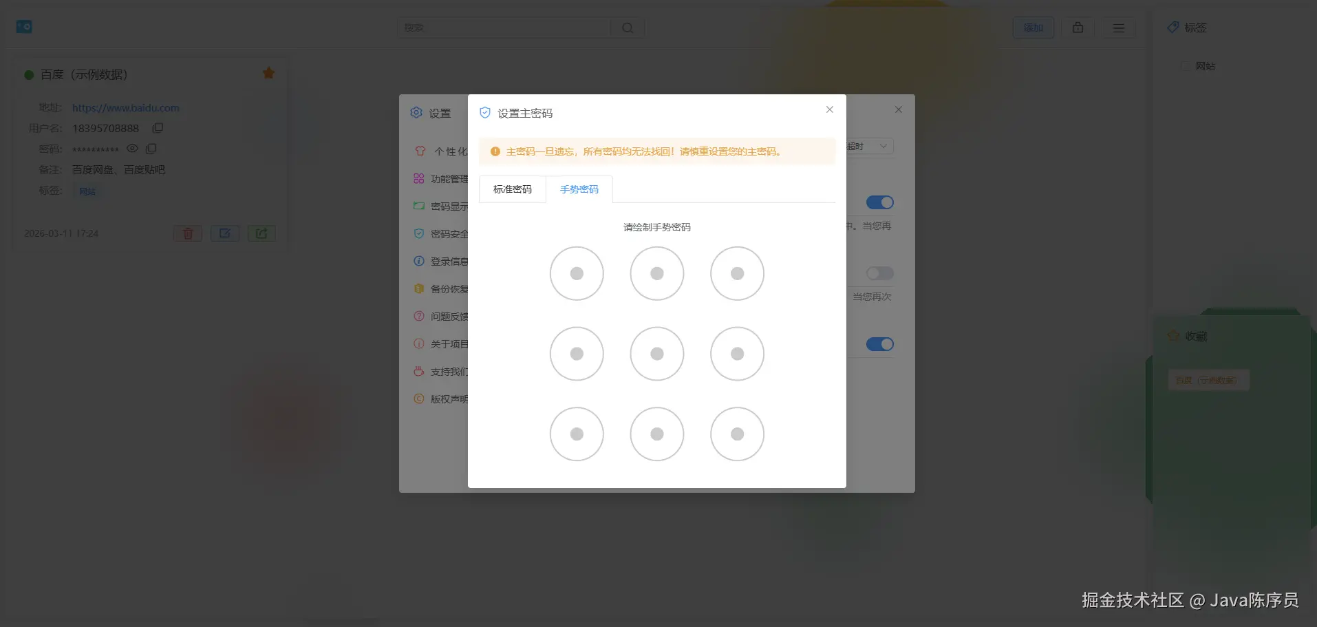 设置存储方式成功后,需要设置主密码,支持标准密码和手势密码两种方式。