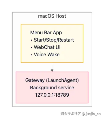 macOS 生产部署使用 LaunchAgent 来将 Gateway 作为后台服务运行。该服务在登录时自动启动,并持续运行。macOS 菜单栏应用为 Gateway 提供了启动、停止和重新启动的原生界面。它包括直接嵌入应用中的 WebChat UI、用于免提操作的语音唤醒功能,以及通过回环接口的本地访问。可通过 SSH 隧道或 Tailscale 实现远程访问。