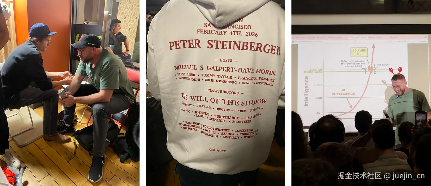 仅仅几周后,在 2 月 5 日,Michael Galpert 和 Dave Morin 组织了该系列的第三场活动,并将其重新命名为 ClawCon,即第一届 OpenClaw SF Show & Tell。超过 700 人参加。现场气氛热烈。投资者 Ashton Kutcher 花了近一个小时听取人们向他推销项目。OpenClaw 的创造者 Peter Steinberger 是当晚真正的“好莱坞式”明星,周围全是向他提问、祝贺和自拍的人。