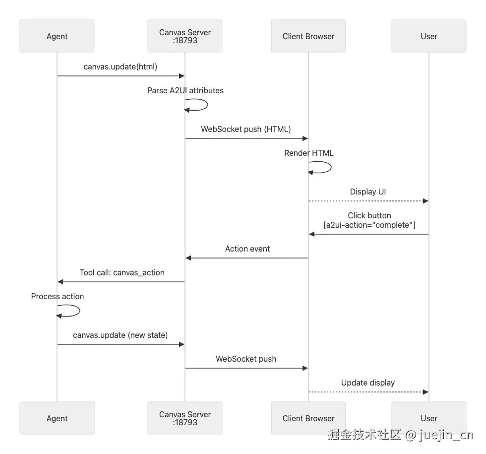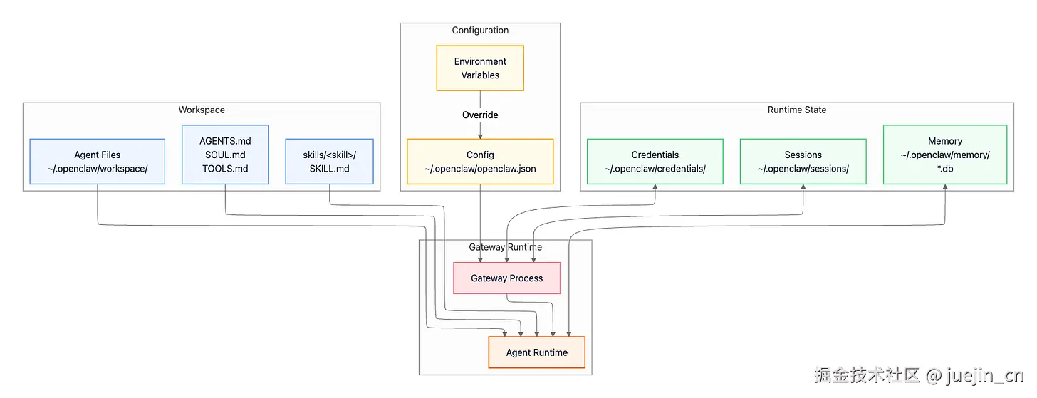 - 智能体运行时负责端到端运行 AI 环路,从会话历史和记忆中组装上下文,调用模型,执行针对系统可用能力的工具调用(如浏览器自动化、文件操作、Canvas、计划任务等),并持久化更新后的状态。