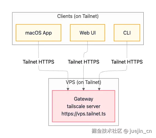 Tailscale 提供了一种替代的 VPS 部署方案。您无需维护 SSH 隧道,而是将您的 VPS 和客户端设备都加入同一个 Tailscale 网络(一个“tailnet”)。VPS 使用 Tailscale Serve 通过 HTTPS 将网关暴露给 tailnet 上的其他设备(例如, https://vps.tailnet.ts )。这种方式提供了加密访问,无需管理 SSH 密钥或隧道进程。