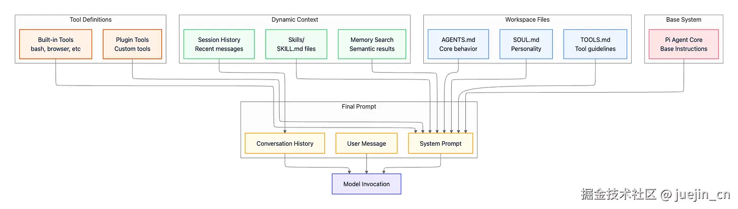 所有这些元素组合成最终的系统提示词,该提示词连同对话历史记录和当前用户消息一起发送给模型。这种组合式方法意味着您可以通过编辑工作区中的文件来更改智能体行为、风格和任务能力,而无需触碰源代码,同时保持由运行时强制执行的执行、权限和沙箱化。