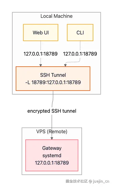 一旦隧道建立,您的本地 CLI 和 Web UI 连接到您机器上的 127.0.0.1:18789 ,流量将通过加密的 SSH 隧道透明地转发到远程网关: