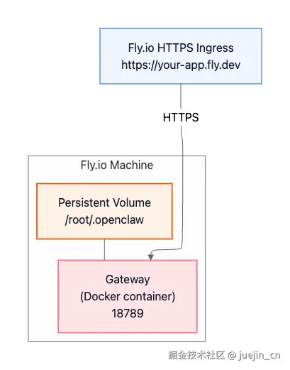 Fly.io 是一种云原生部署选项,网关在由 Fly.io 管理的 Docker 容器中运行。持久化卷存储 OpenClaw 状态(配置、会话、凭证),使其在部署和重启后仍然存在。Fly.io 在容器前面提供了一个托管的 HTTPS 端点(带有 TLS 终止),使网关可以通过公共互联网远程访问。
