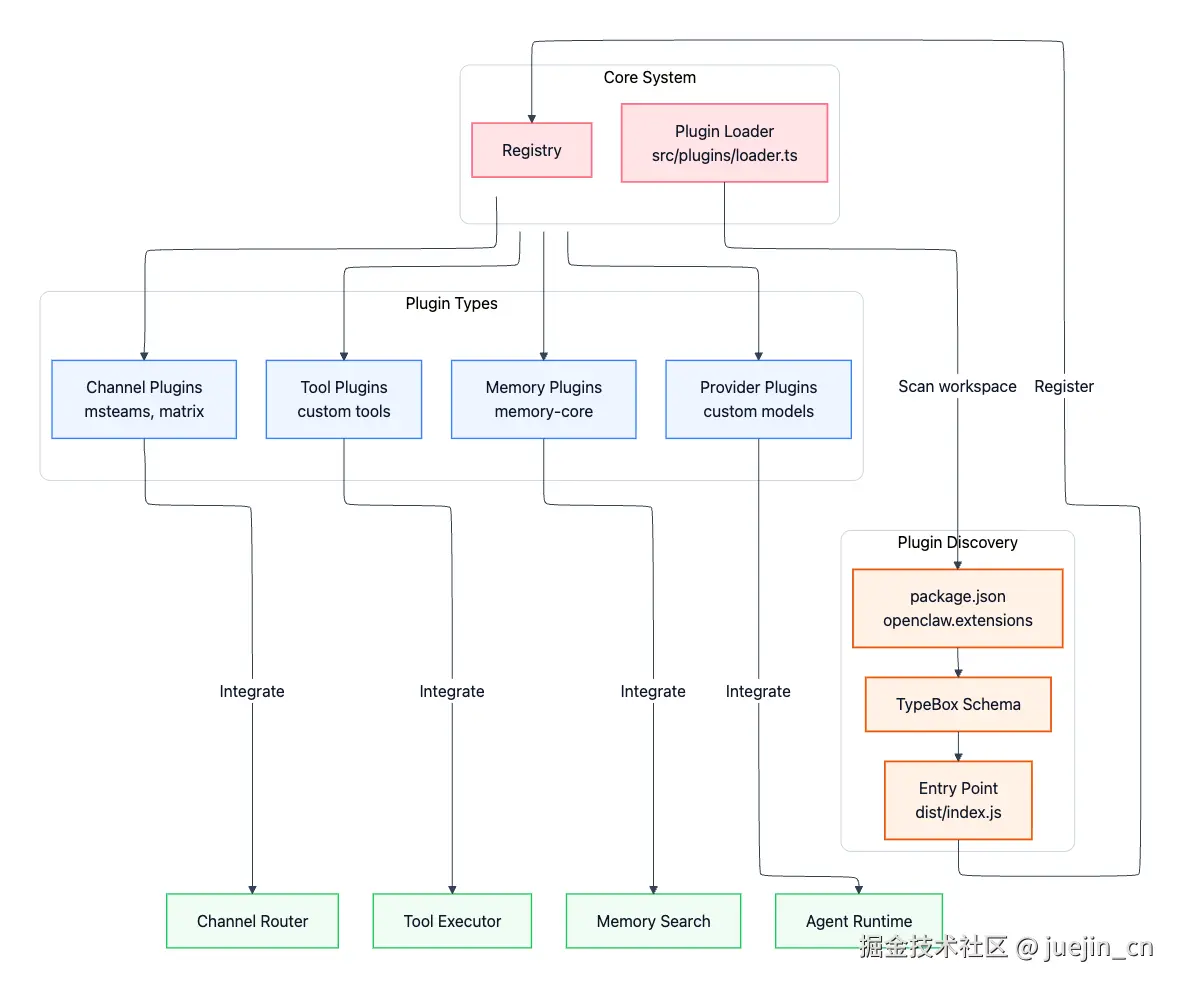 插件系统位于 extensions/ ,遵循基于发现的模型。 src/plugins/loader.ts 中的插件加载器扫描工作区包中的 package.json 中的 openclaw.extensions 字段,根据声明的模式进行验证,并在配置存在时热加载。