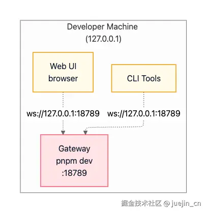 在本地开发设置中,所有内容都在开发机器上运行。您使用 pnpm dev 在前台启动网关,这可以在代码更改时启用热重载。网关绑定到 127.0.0.1:18789 ,只能从本地机器访问。CLI 工具和 Web UI 直接连接到此回环地址。由于回环接口被视为可信,因此无需进行认证,调试日志以最大详细程度运行。