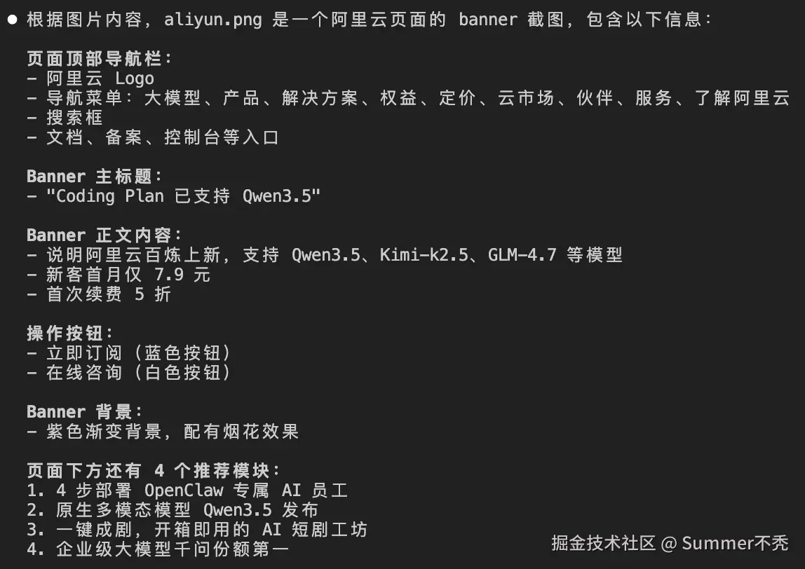 然后提问:请加载image-analyzer skill,描述一下 aliyun.png banner位置是什么信息。可收到如下回复: