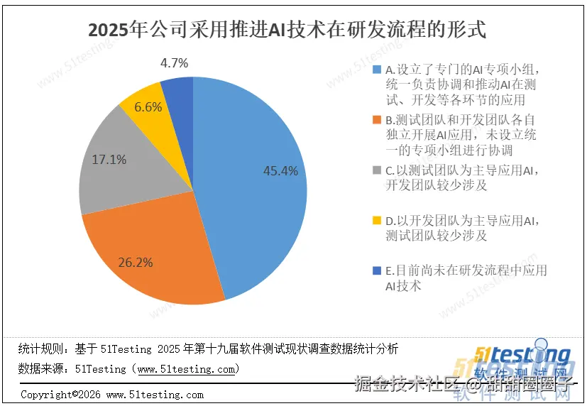 根据2025年度的调查结果,公司推进AI技术在研发流程(含测试、开发环节)中的应用,主要存在以下几种组织形式,其分布占比如下:
