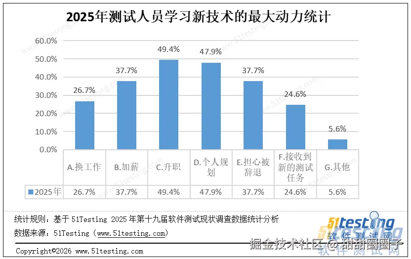 根据调查数据,软件测试从业人员学习测试新技术的动力及占比如下:
