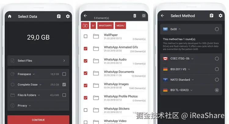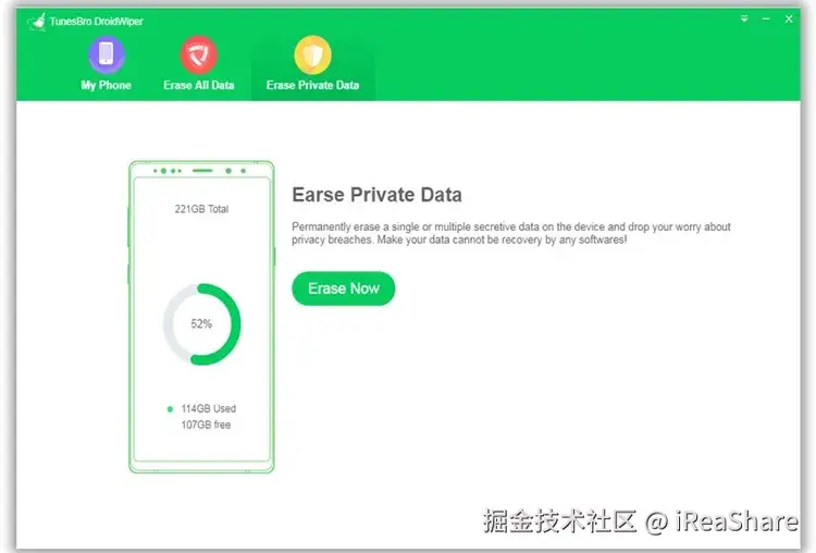 iReaShare Android 数据擦除器以其高安全标准而著称。它旨在彻底 清除所有数据,包括联系人、短信、应用程序数据的私密片段、密码、搜索历史记录等等。该工具采用军用级覆盖算法(符合美国国防部 5220.22-M 标准),确保数据一旦被清除,任何已知的取证工具都无法恢复。