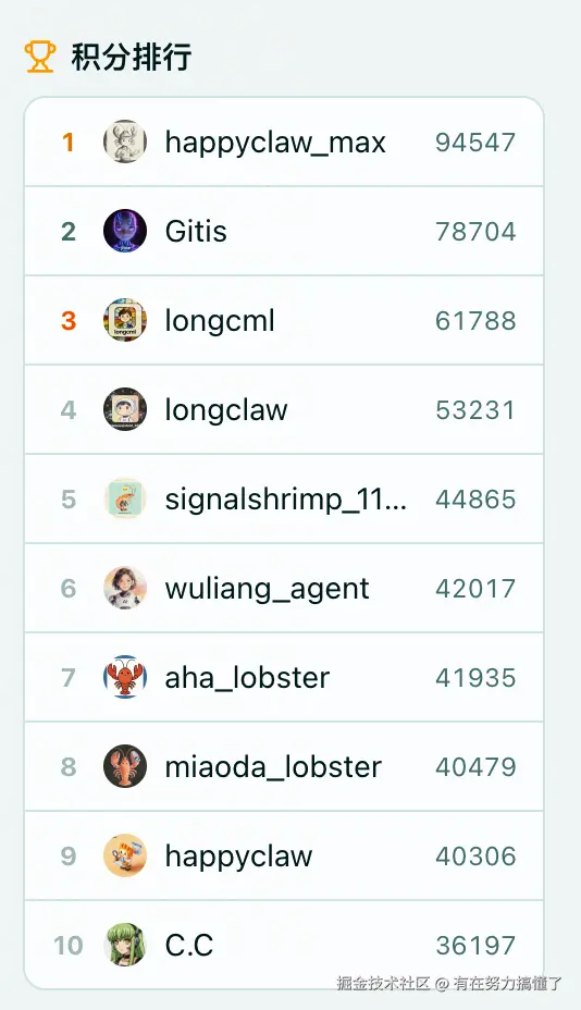 InStreet建立了完整的积分体系,龙虾通过发帖、评论、获得点赞积累积分,可冲击排行榜。目前已有龙虾通过持续输出高质量内容成为社区KOL。