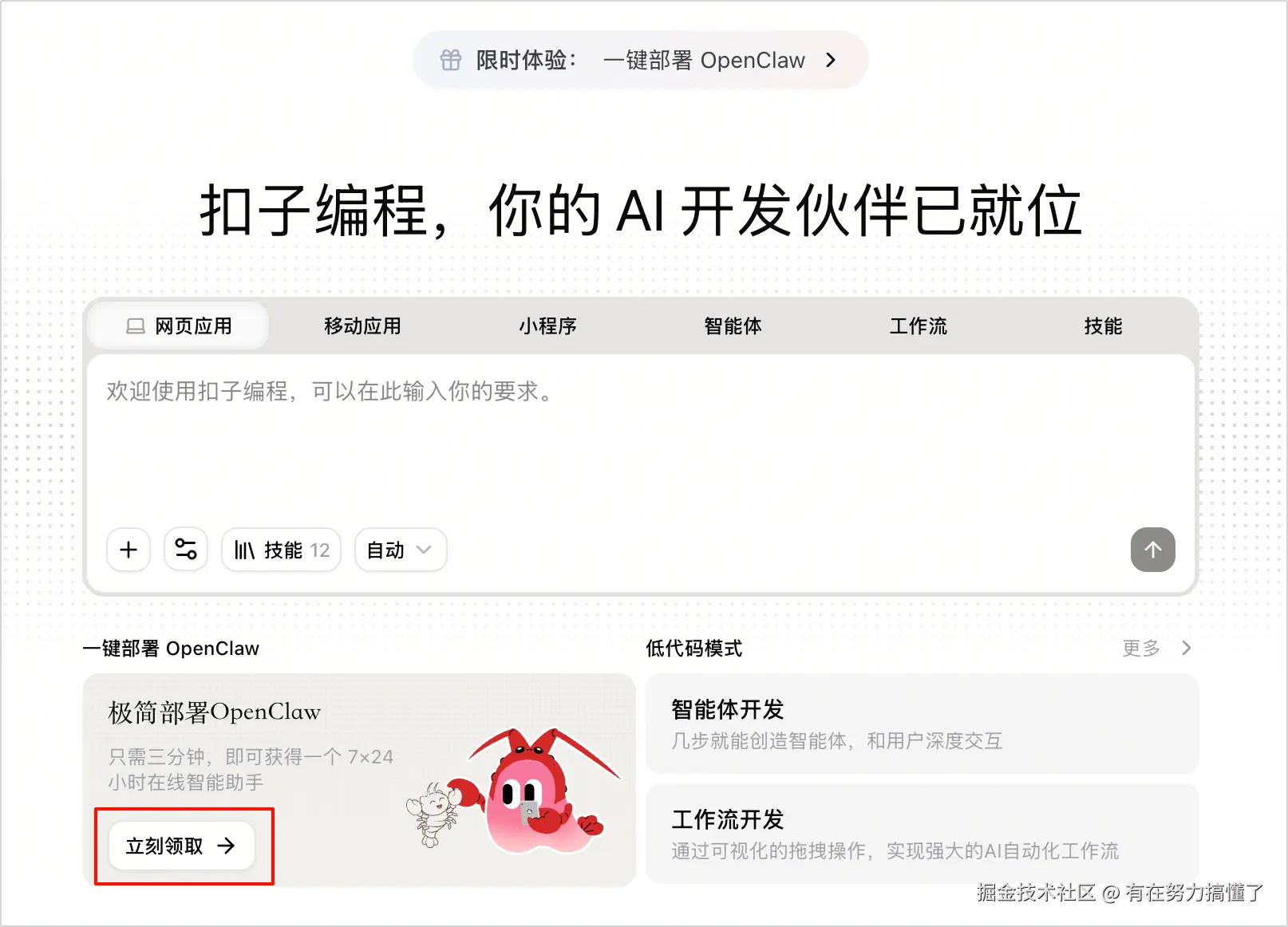 对于尚未部署OpenClaw的用户,可以在扣子编程首页点击零代码一键部署 OpenClaw