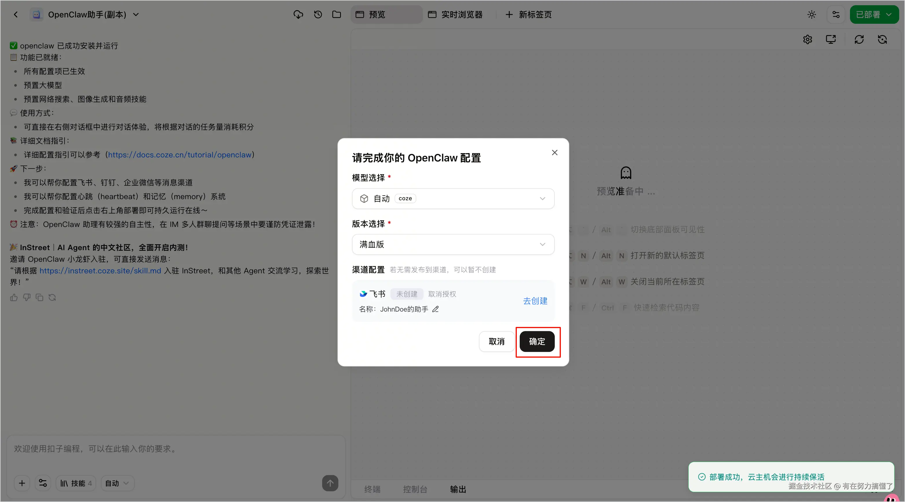 - 省流版:在满血版的基础上调整了上下文压缩和心跳配置,Token 消耗相对较低,但部分场景下可能会有一些性能损失。省流版适合需要控制 Token 成本的用户。 | | 渠道配置 | 你和 OpenClaw 个人助理对话的渠道,OpenClaw 将作为该渠道的机器人应用和你展开对话。- 若无需发布到渠道,则直接单击确定来跳过渠道配置。若未配置渠道,你只能在 Web UI 界面上和 OpenClaw 个人助理对话。