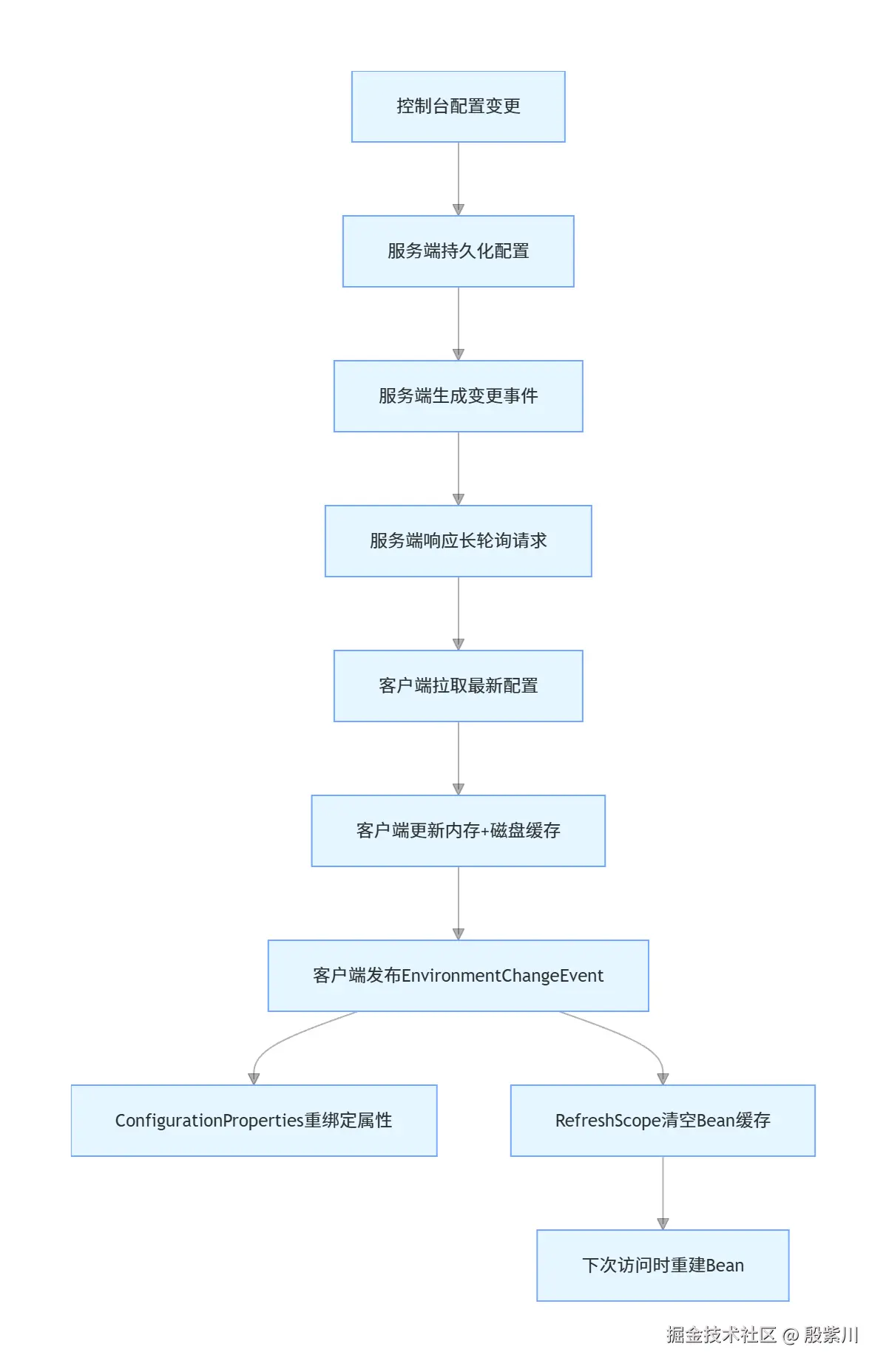 EnvironmentChangeEvent事件时,RefreshScope会监听该事件,清空内部持有的Bean实例缓存,销毁原实例 - 下次调用代理对象的方法时,会重新创建Bean实例,注入最新的配置属性,完成刷新