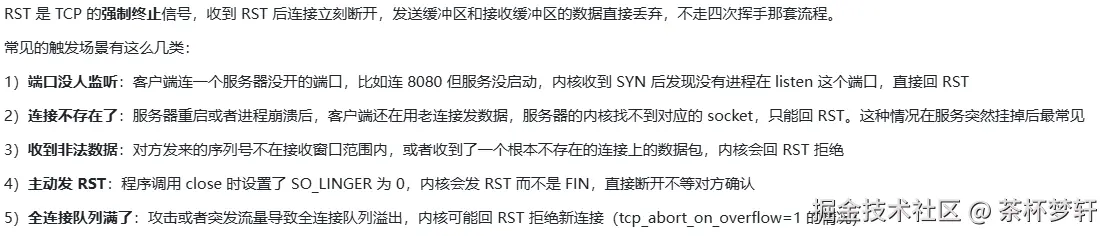 RST与FIN报文不同,它不会等待另一方回复ACK,而是直接断开连接,发送缓冲区和接收缓冲区的数据直接丢掉