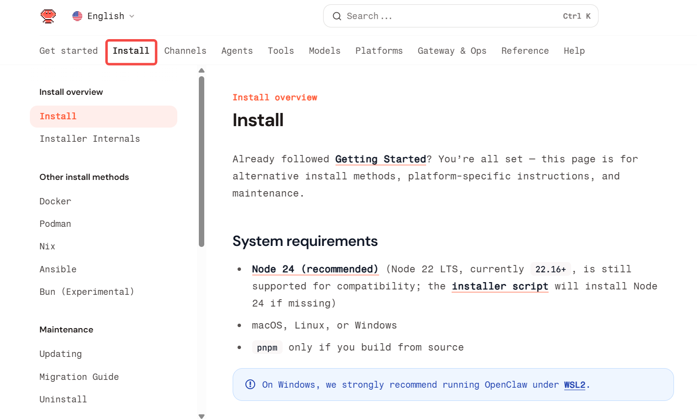 装任何东西之前,先看官方文档。OpenClaw 官网的安装指引写得很清楚,这个后面要发给 AI 当「说明书」用。