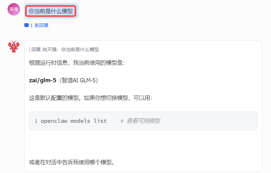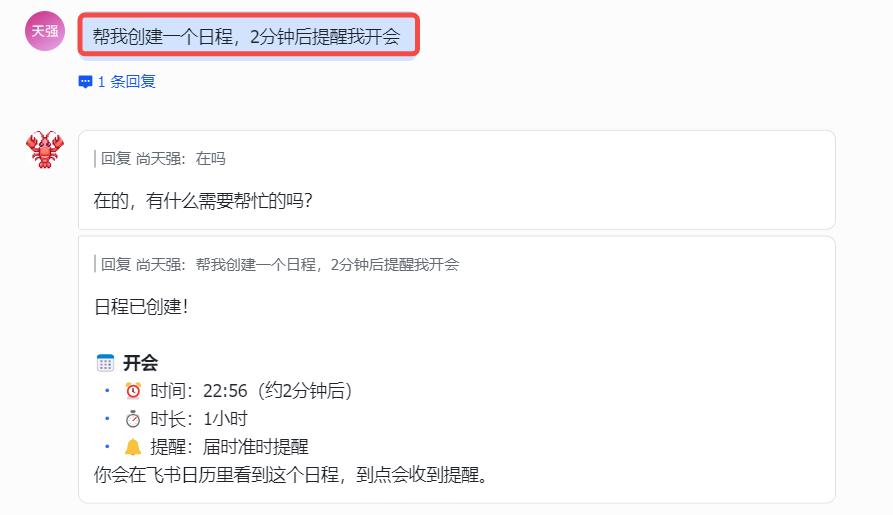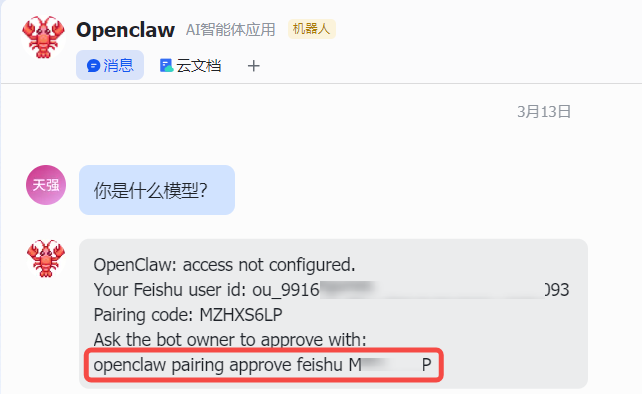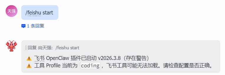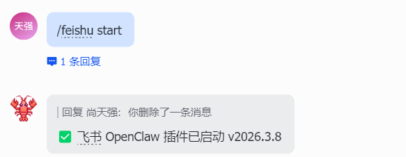 然后在飞书里给 AI 发消息:/feishu start,如果看到下面的结果: