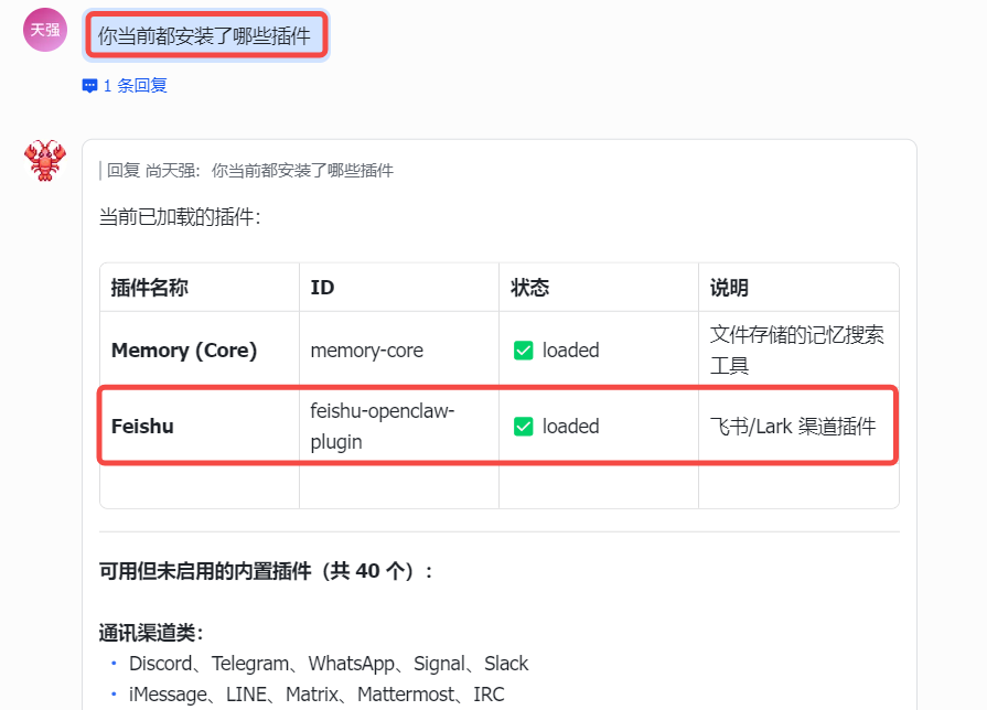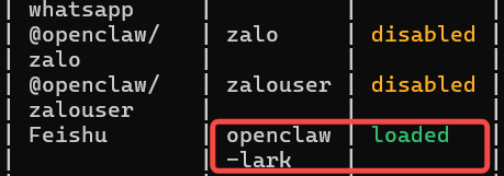 看到 ID 是 openclaw-lark,Status 是 loaded,就说明装好了。