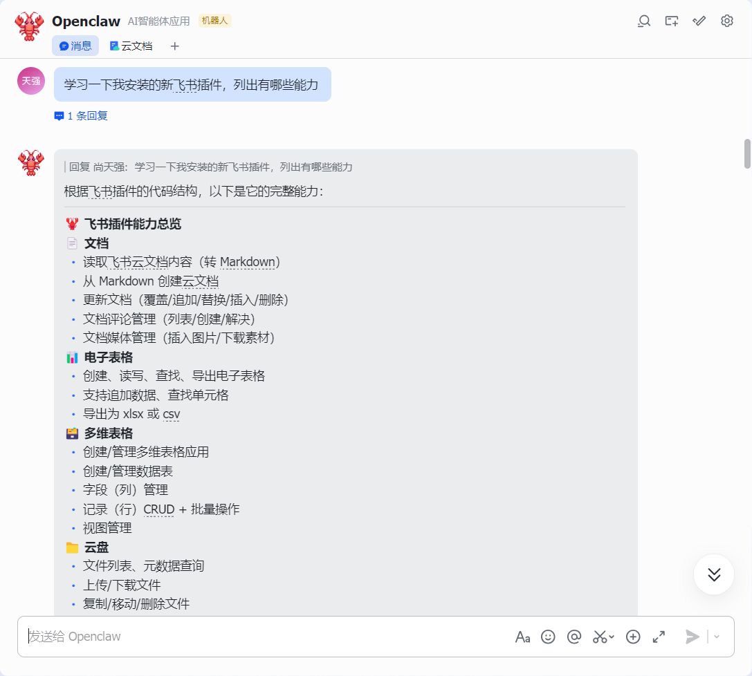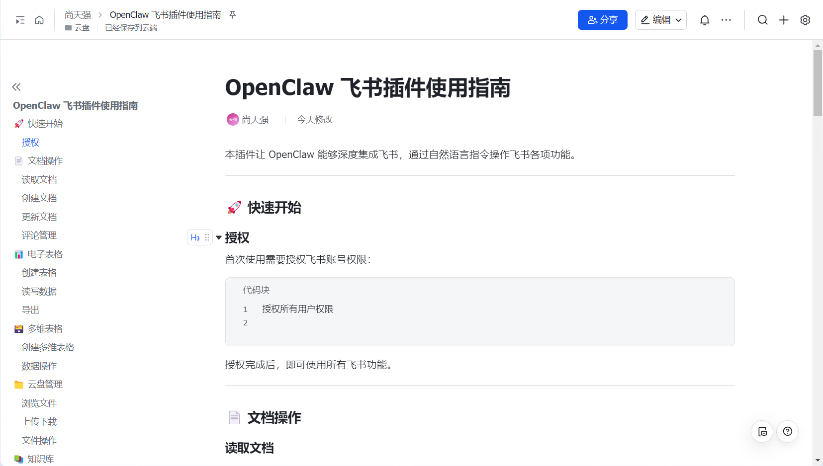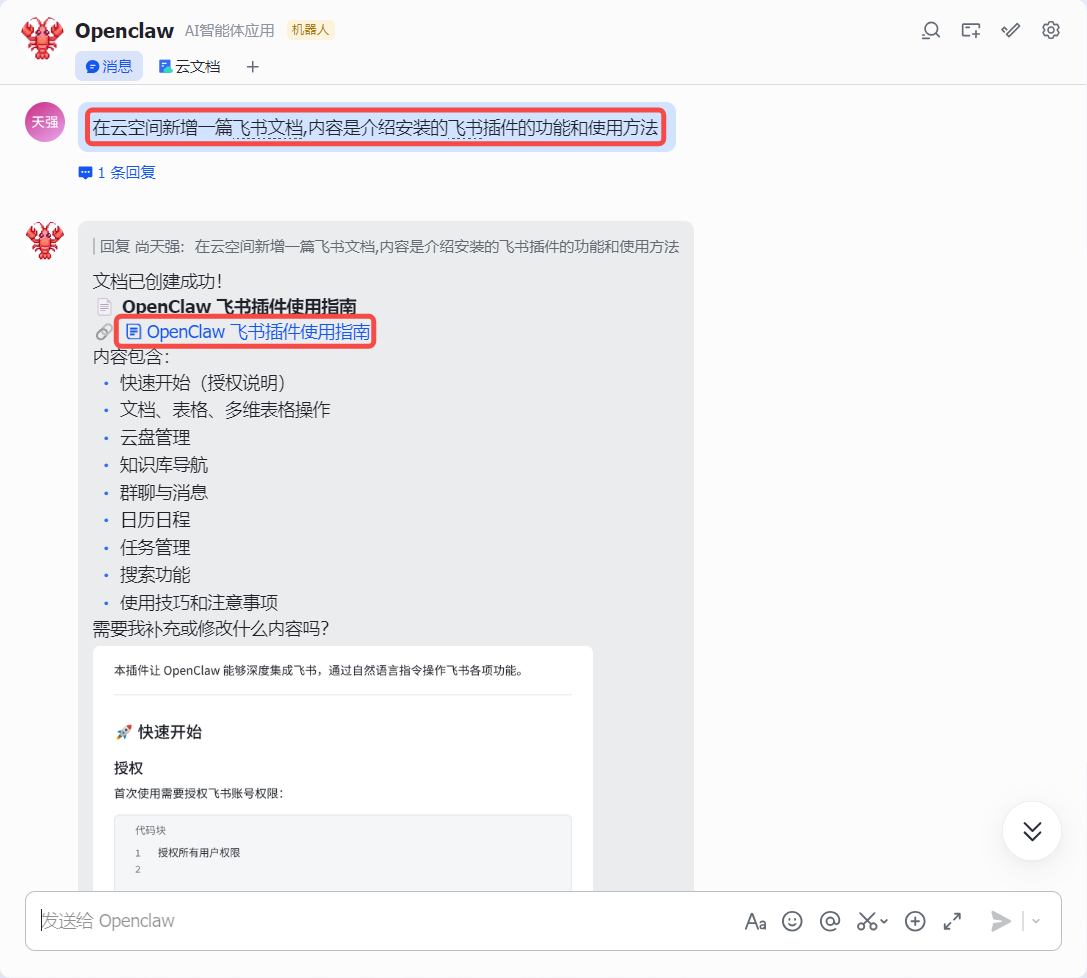 在云空间新增一篇飞书文档,内容是介绍安装的飞书插件的功能和使用方法