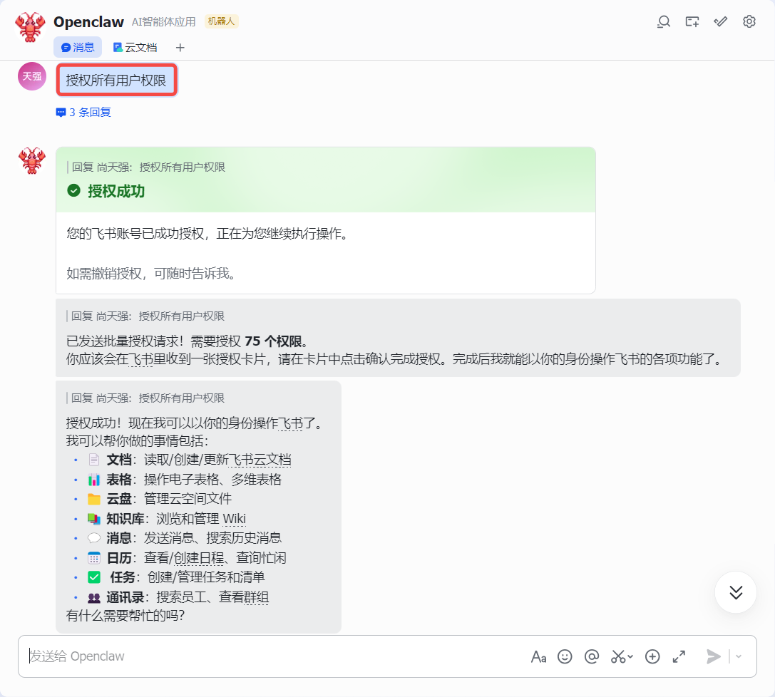 有些功能要权限。用 /feishu auth 这个命令批量授权,或者直接跟 OpenClaw 说: