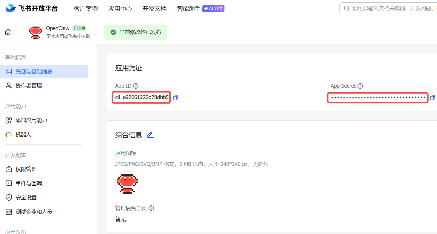 如果你之前已经建过机器人,命令行会问你用不用现有的。去飞书开放平台找 App ID 和 App Secret 就行。