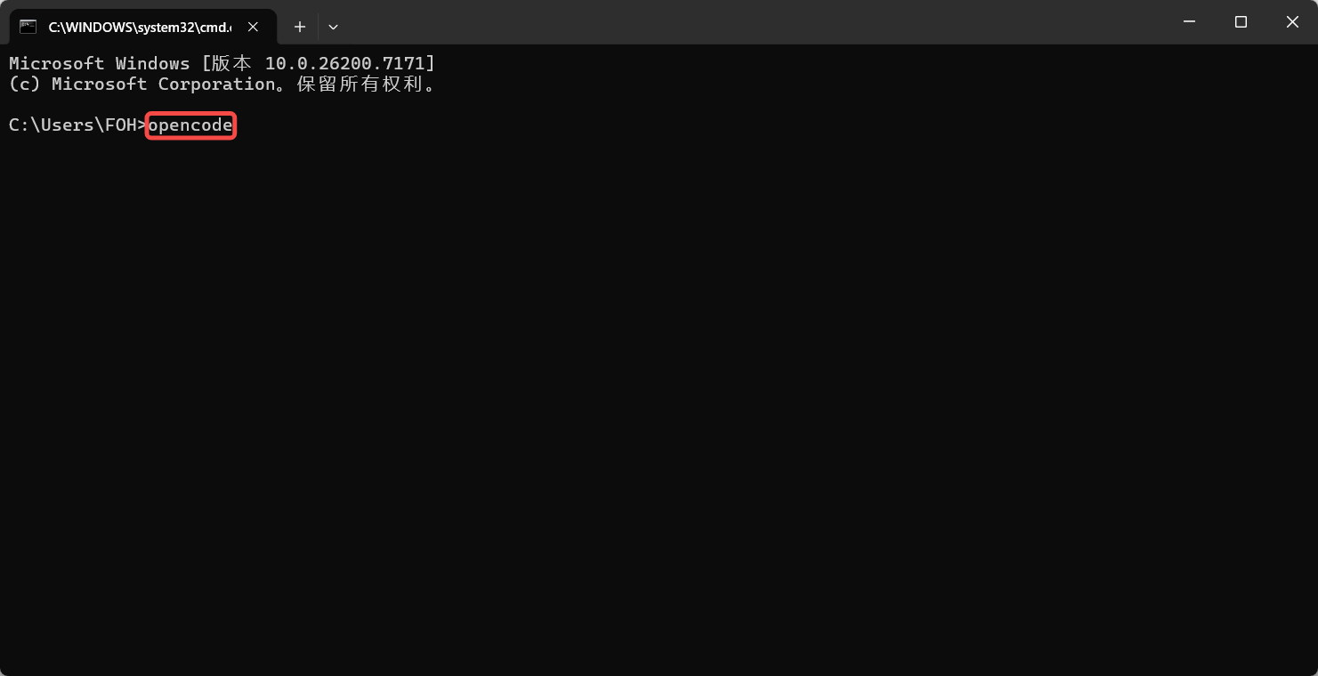 这次用的工具是 OpenCode。打开电脑终端,输入 OpenCode。
