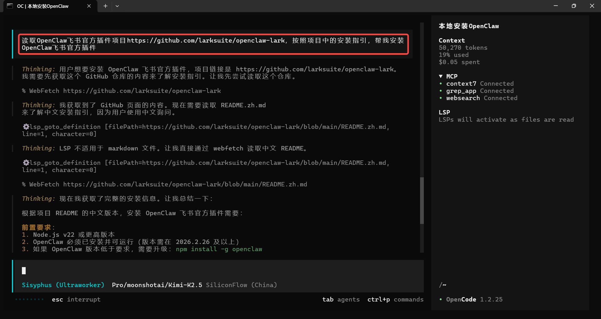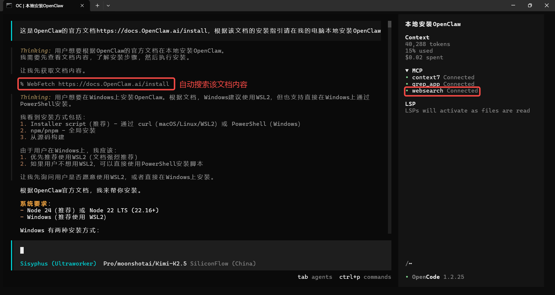 OpenCode 自带 websearch 工具,能自己读懂文档内容。