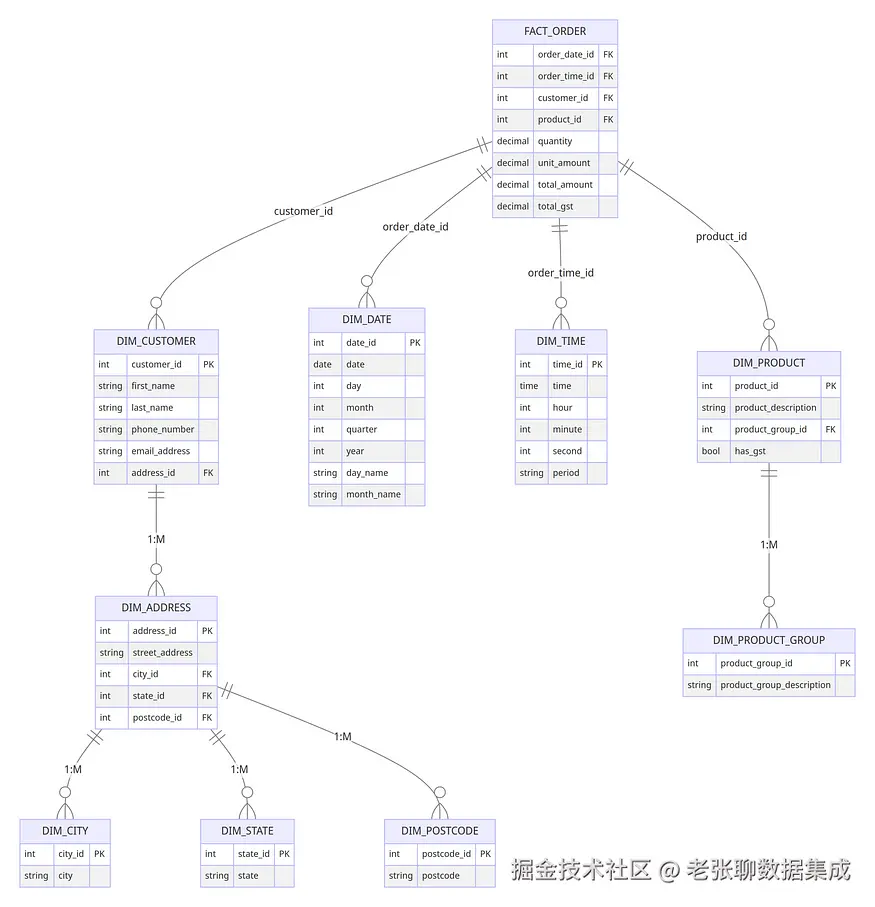 这是数据仓库领域应用最广、最经典的模型,它的目的就是为了提升查询性能,结构非常简单,中间一张事实表,周围一圈维度表,看起来像一颗星星,它的名字由此而来。