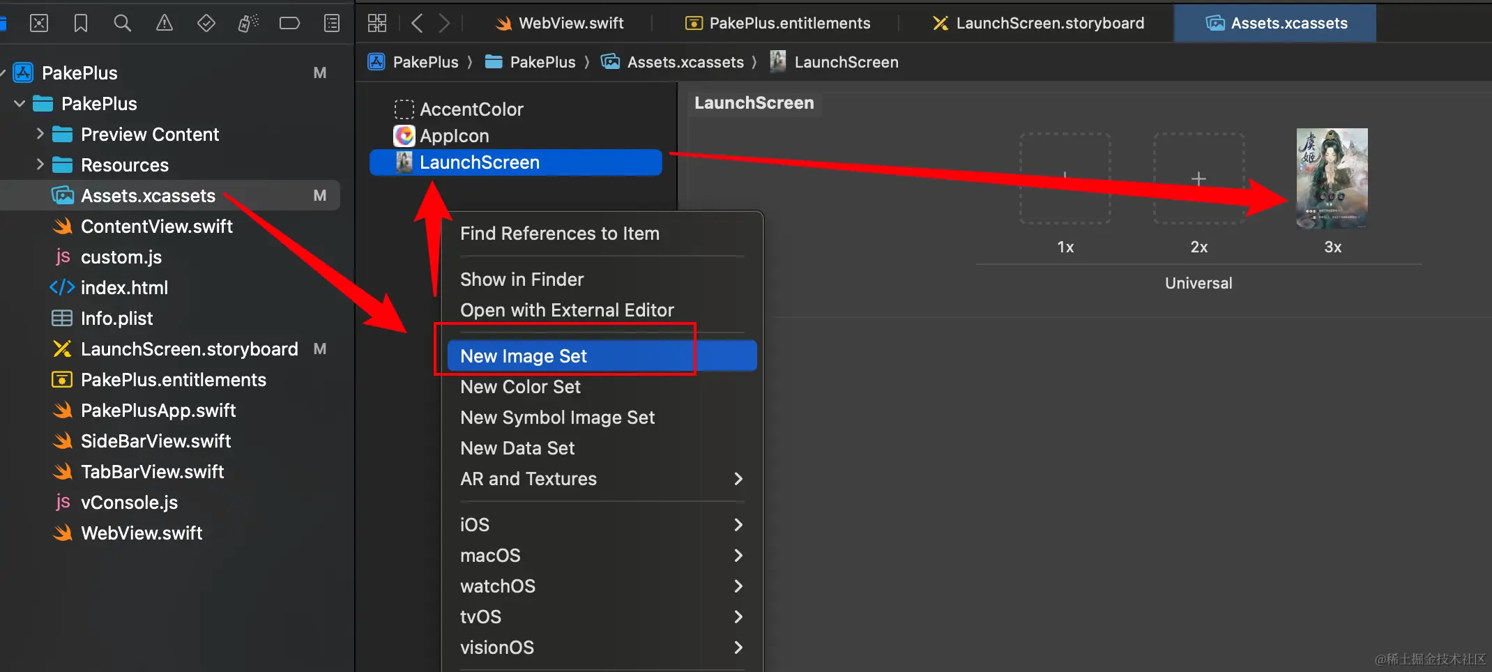 先在Assets.xcassets里添加一张图片,作为启动图的基础,在Images.xcassets中添加名为LaunchScreen的Image Set:并添加图片进入