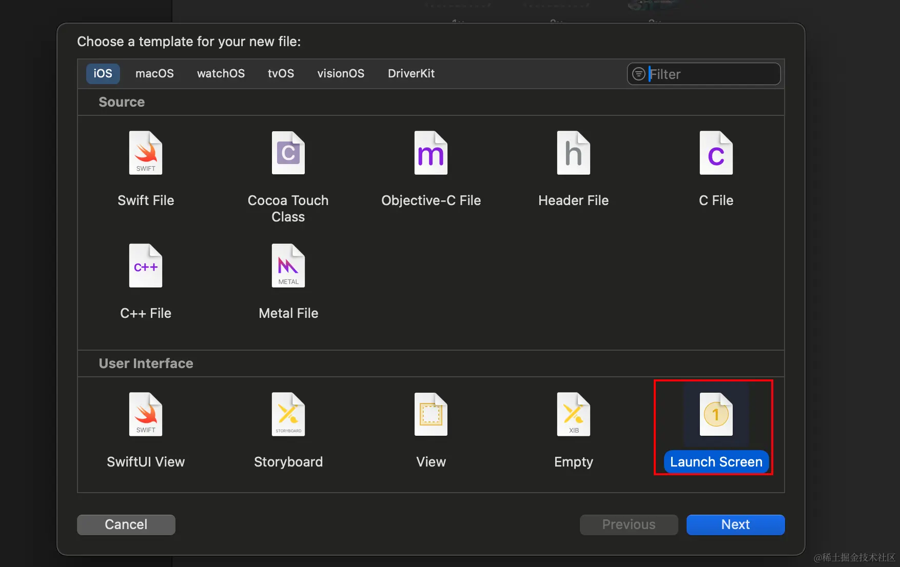 然后创建一个文件 LaunchScreen.storyboard , 在File > New > File from Template 下有一个模板可以使用: