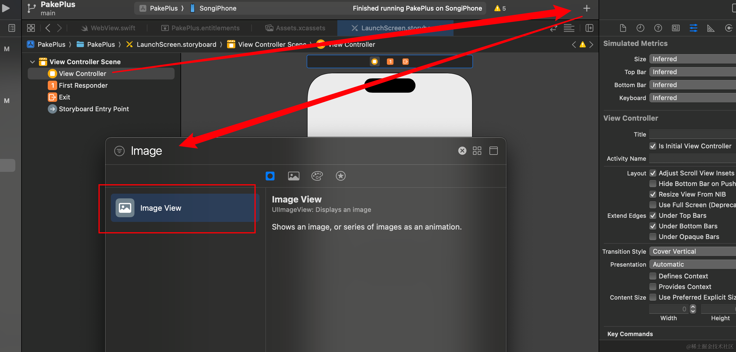 然后选中 ViewController 添加一个ImageView,搜索到之后,直接拖动这个ImageView到视图中即可: