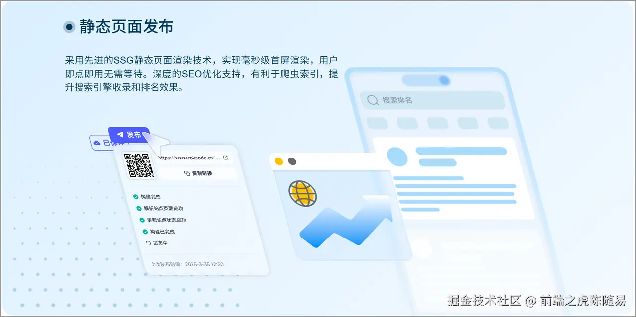 再比如发布能力。程序员都知道,页面能不能发出去和页面发出去之后跑得怎么样,是两回事。很多项目其实不是死在开发阶段,而是死在访问体验阶段:首屏慢、白屏久、打开卡、搜索表现差,结果运营同事拼命拉来的流量,页面自己没接住。对于 H5 这种非常依赖打开速度和即刻体验的场景来说,发布方案是不是更偏向高性能、是不是对首屏更友好,影响非常现实。