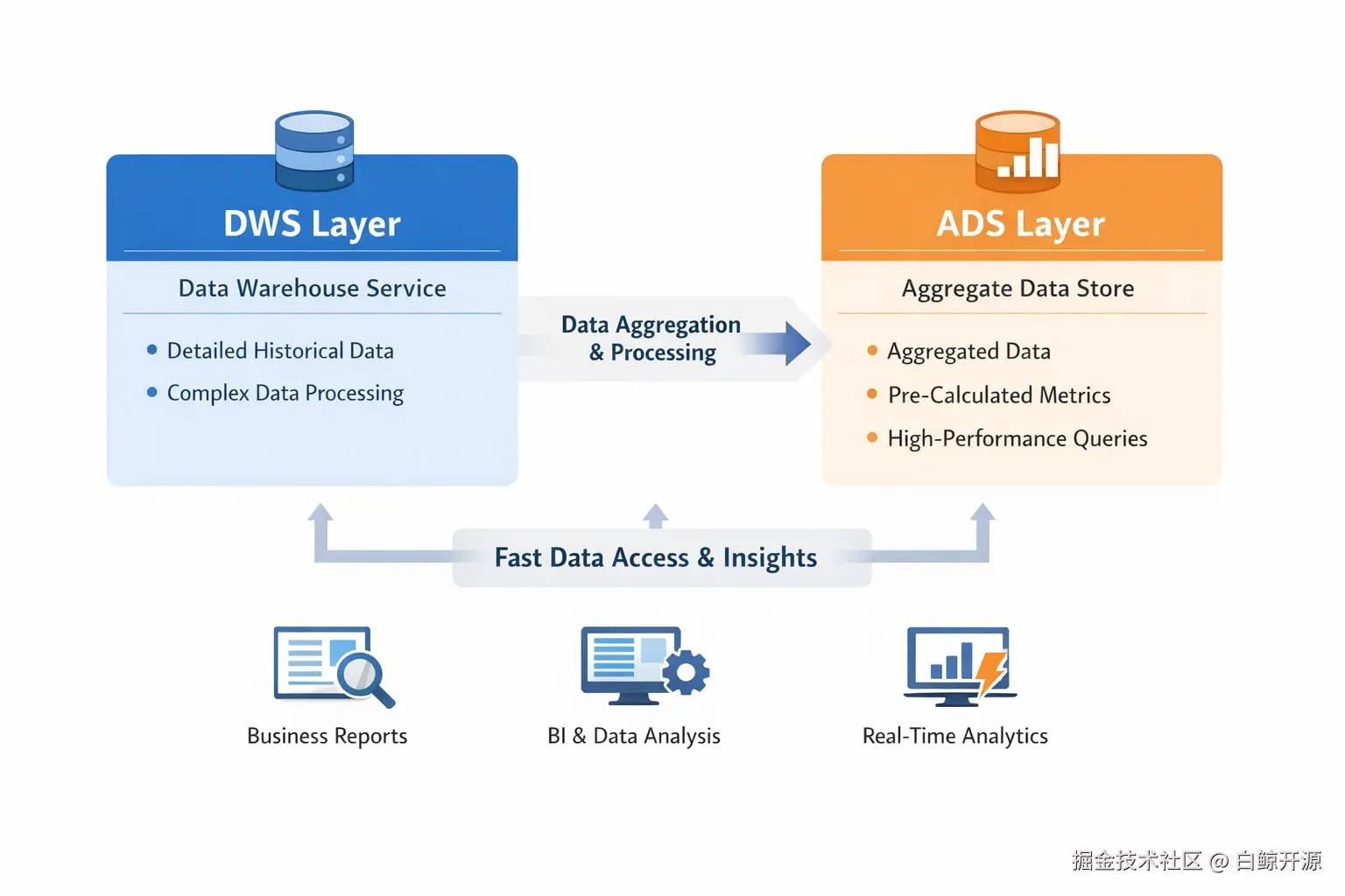 在数据仓库体系中,DWS 与 ADS 层是从“数据建模”走向“数据交付”的关键分界点。前者承载公共汇总与指标复用能力,决定数据体系的稳定性与复用效率;后者面向具体消费场景,直接影响业务交付效率与使用体验。